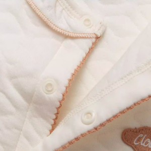 襟のデザイン:繊細なレーストリムの襟がエレガントな魅力を添えます。柔らかな裏地が赤ちゃんの首に心地よくフィットし、美しい見た目も演出します。